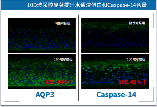 10D 玻尿酸:通過10種玻尿酸科學復配,包含大分子玻尿酸、超小分子及玻尿酸衍生成分,可以協同促進AQP3、FLG、Casepase-14等皮膚關鍵蛋白的表達,實現層層滲透、高效修護,充盈肌膚水循環生態系統。