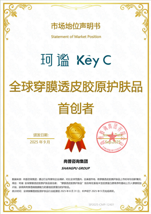 近日,福瑞達(dá)生物股份技術(shù)股份旗下專研輕醫(yī)美圍術(shù)期品牌珂謐KeyC,正式獲得尚譜咨詢授予的“全球穿膜透皮膠原護(hù)膚品首創(chuàng)者”認(rèn)證。